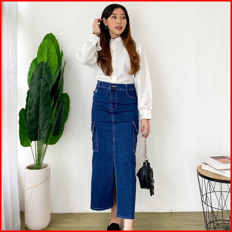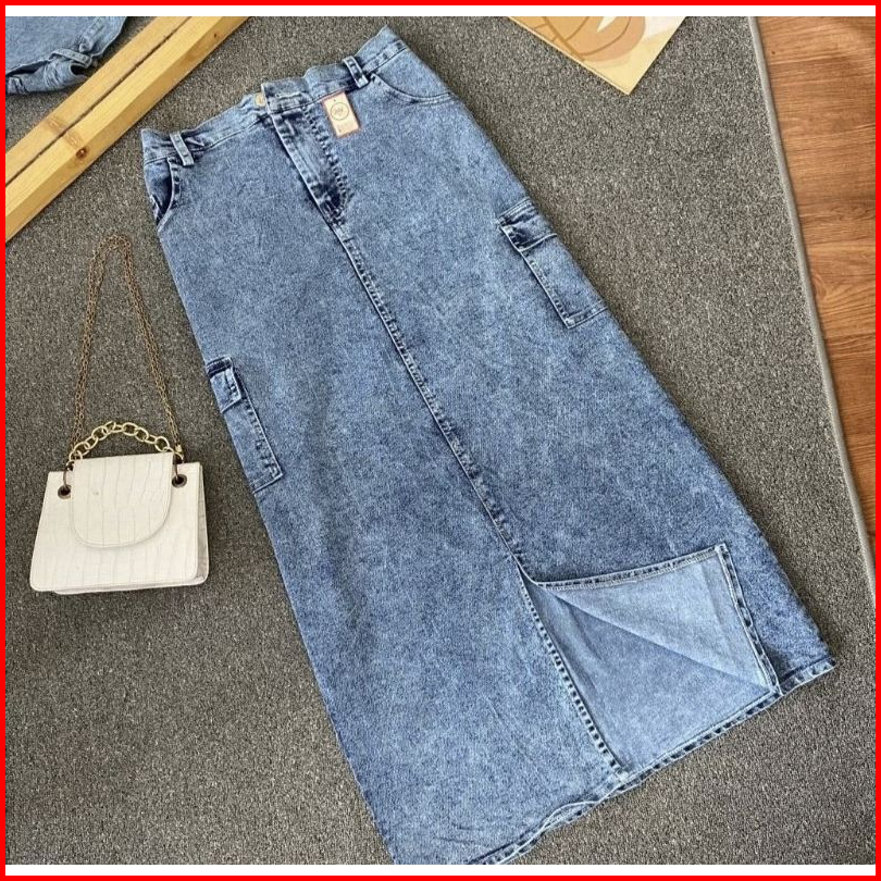 Rok Cargo Jeans Wanita Panjang Belah Depan Korean Style