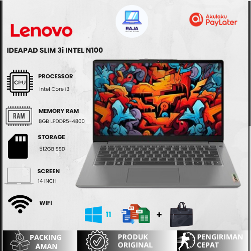 [Mall] LAPTOP LENOVO IDEAPAD SLIM 3 INTEL N100 8GB RAM 512GB SSD WINDOWS 11 FHD 14 INCHI TERBARU