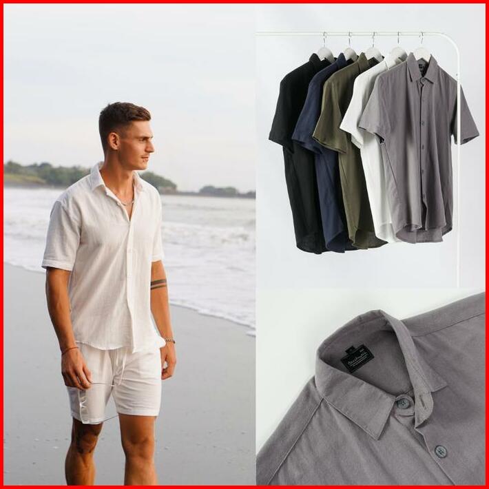 Kemeja Pria Linen Katun Angel Canggu Series Kemeja Pantai Putih Casual Lengan Pendek Polos Beachwell Bali