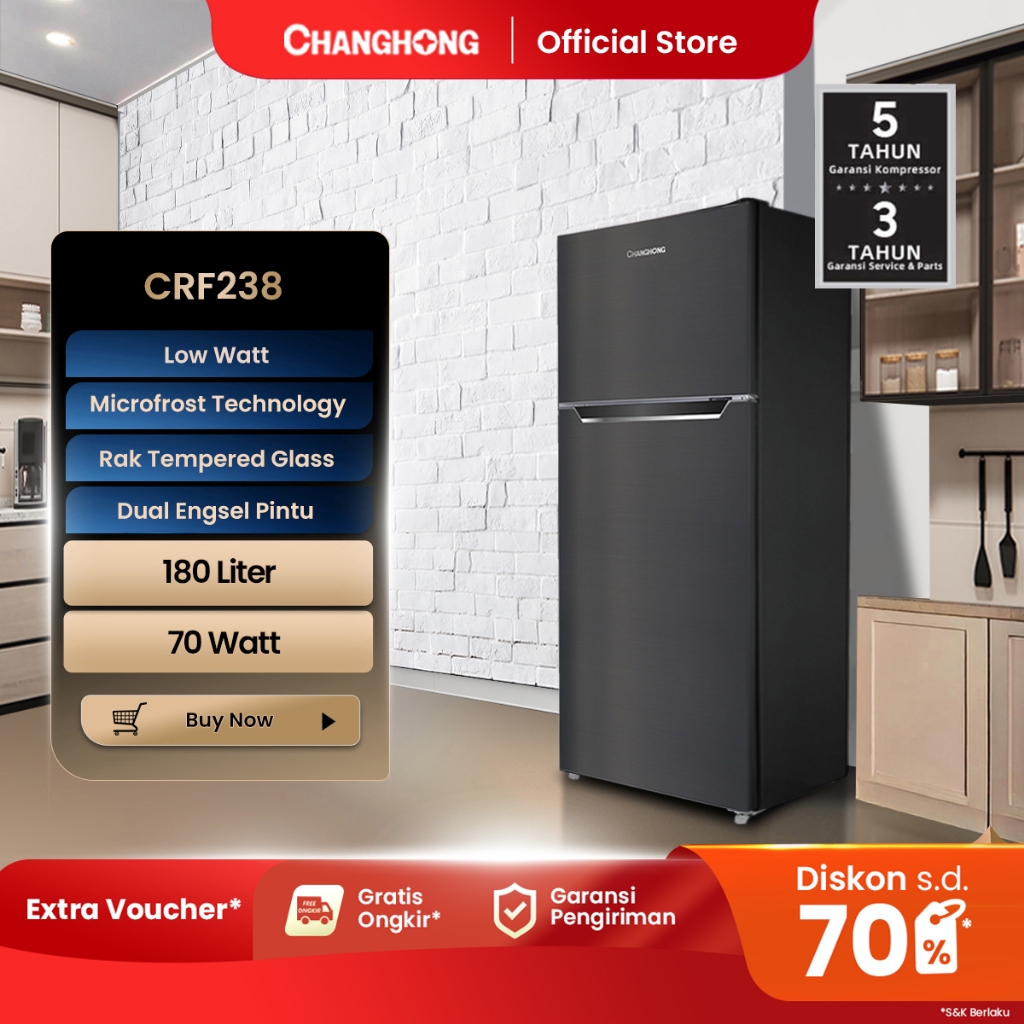 Changhong Kulkas 2 Pintu Refrigerator Kapasitas 122 180 Liter 65 70 Watt CRF 238 FTM155DB MInimalis Murah Berkualitas