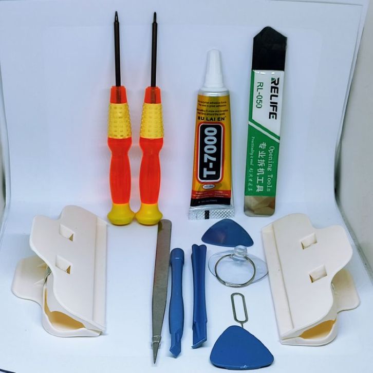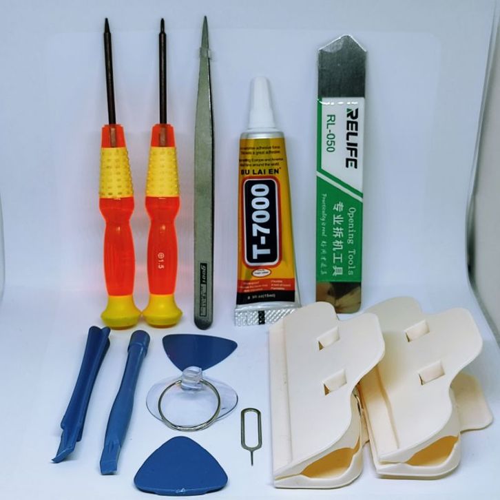 paket kumplit alat servis hp obeng 10 inpaket kum+lem t7000 15ml+penjepit lcd 2pcs+congkelan bisa buat semua hp handpone