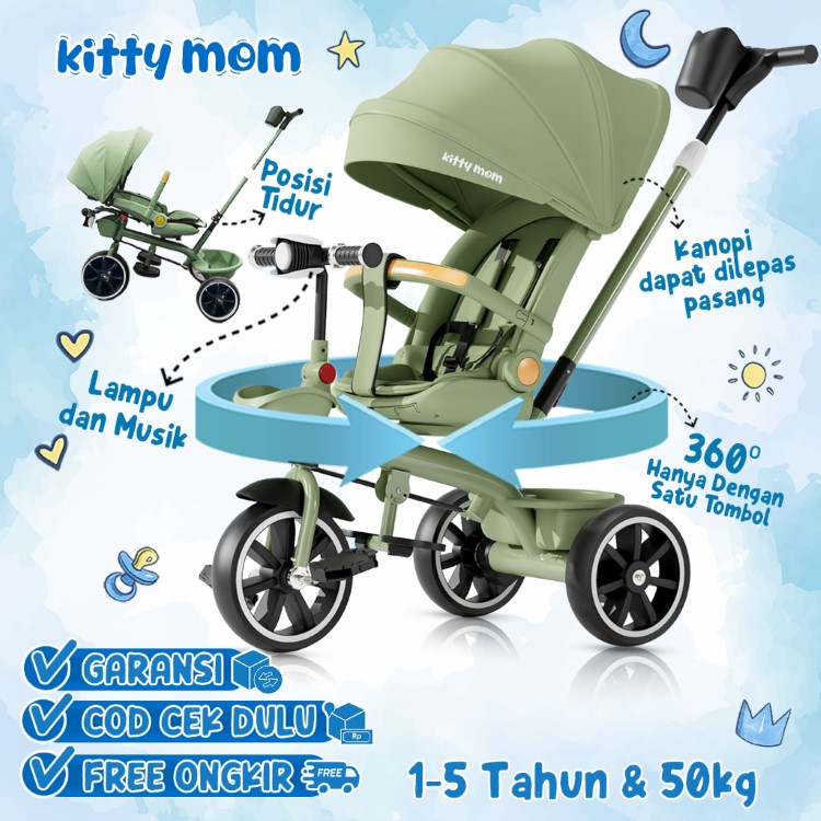 KITTY MOM SEPEDA ANAK RODA 3 BAYI 1 TAHUN TRAVELLING TRICYCLE MULTIFUNGSI BISA PUTAR DAN BERBARING TERBARU MURAH TERLARI