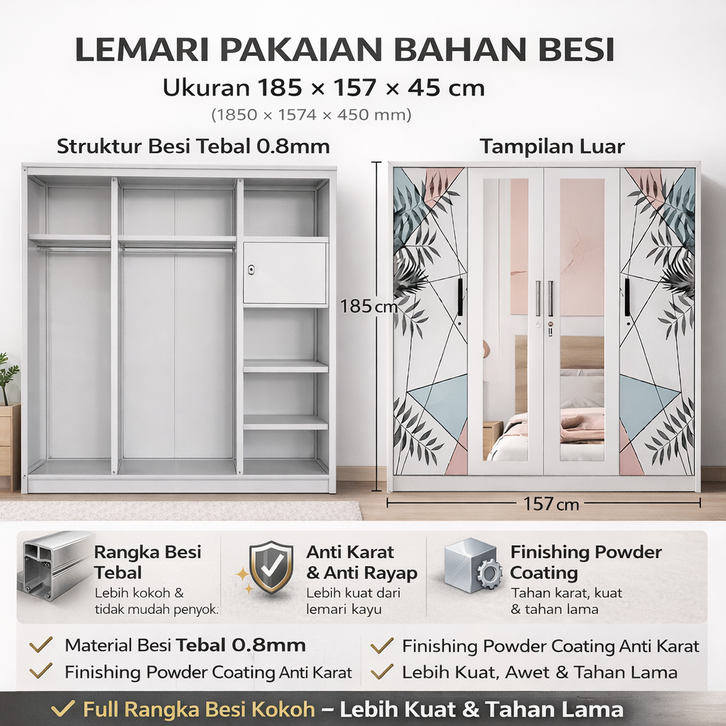 Lemari Baju Pakaian Sliding 4 Pintu Bahan Besi | Minimalis Modern Anti Karat Dan Bergaransi Kaca Pecah