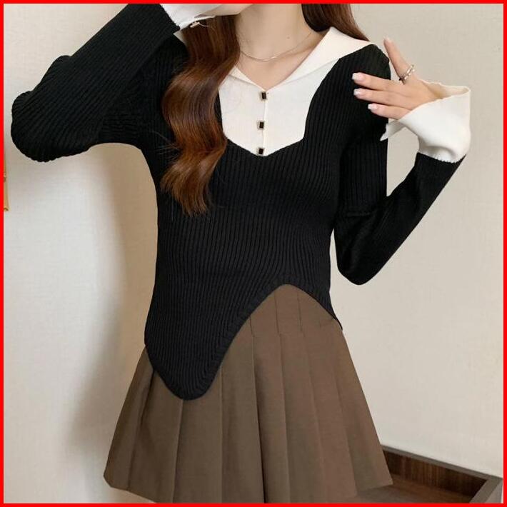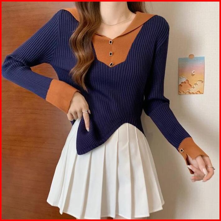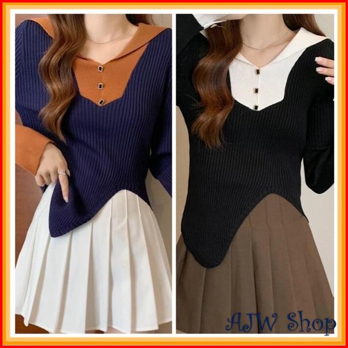 Ajw Xbw Atasan Wanita Long Sleeve Knit Two Tone Atasan Wanita Kekinian Two Tone Knit Baju Kekinianlong Sleeve Knit Two T