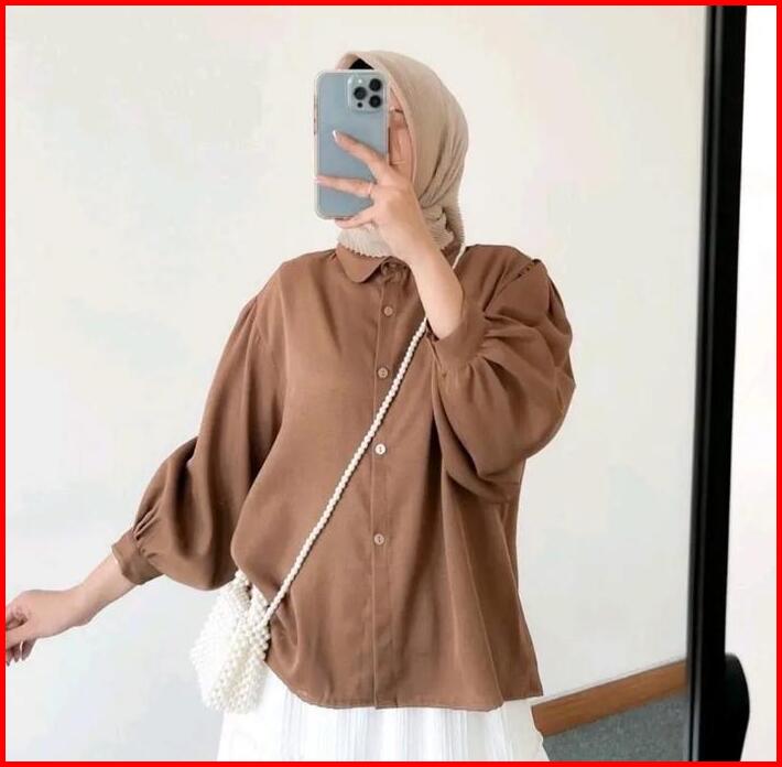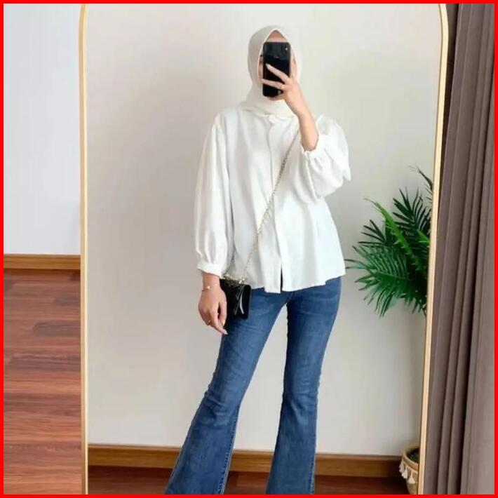Elze Blouse Polos Crinkle Airflow Kemeja Cewek Outfit Wanita Lengan Balon Hitam Putih Atasan Top Baju Kain Oversize Form