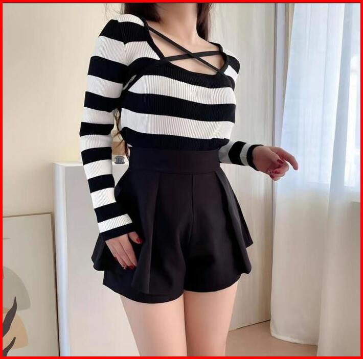 Basic Id Fashion Atasan Rajut Stripe Korean Style Long Sleeve Korea Knitwear Wanita Top Panjang Crop Baju