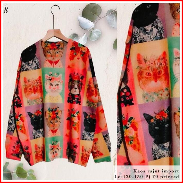 Blus Rajut Premium Halus Dasar Cream Ld 120-130 Wanita Atasan Baju Motif Kucing Bunga