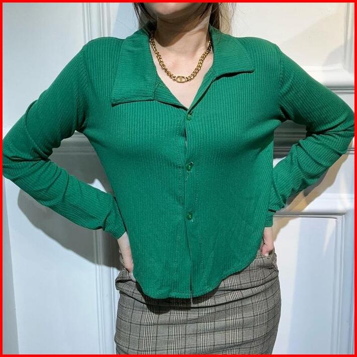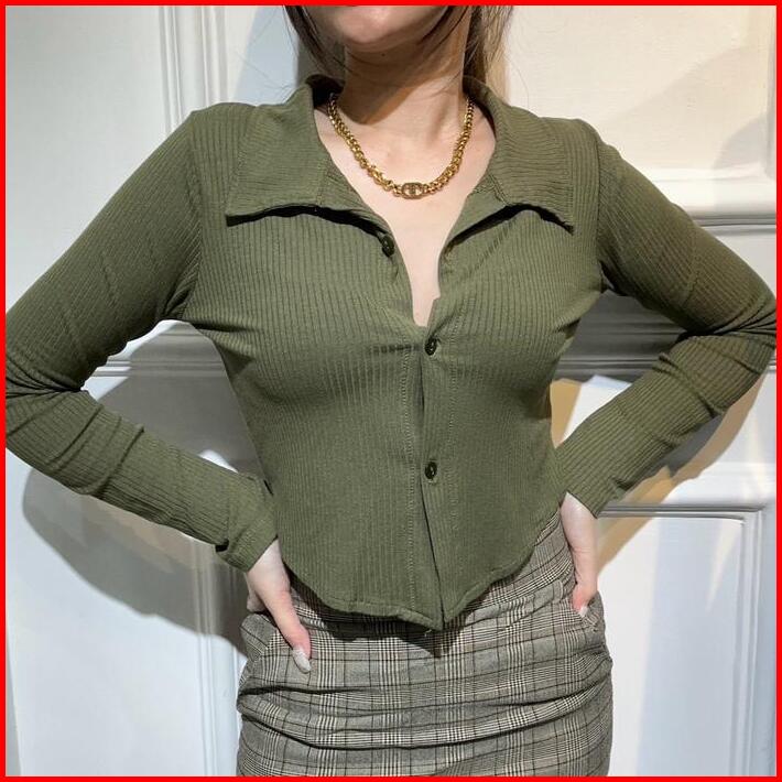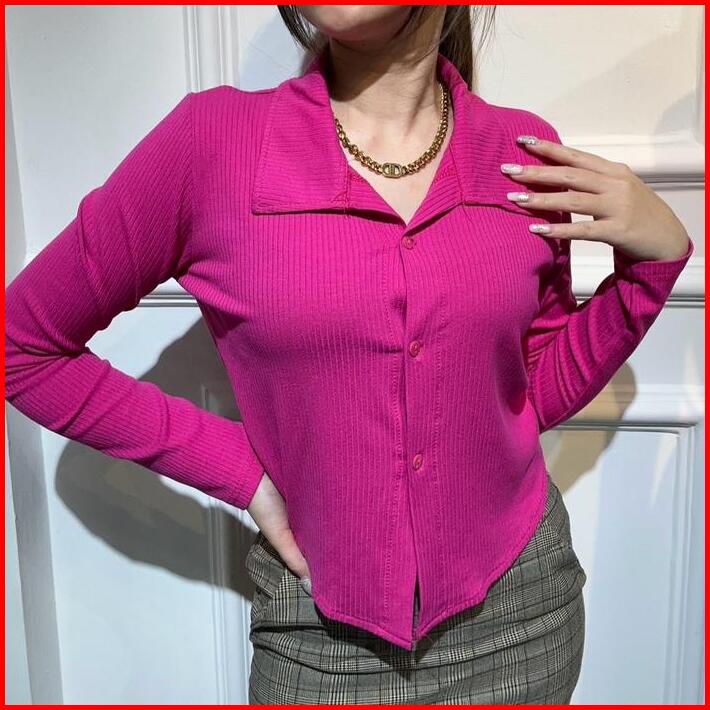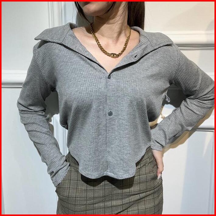 Millie Long Sleeve Kerah Atasan Wanita Lengan Panjang Kancing Kerah Garis Rib Lembut Kaos Basic Baju