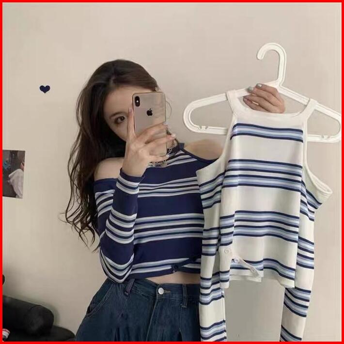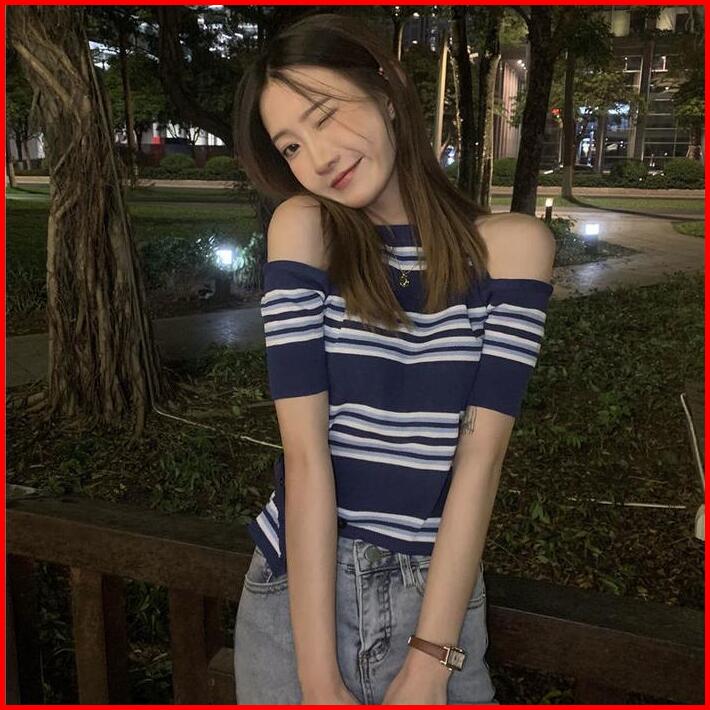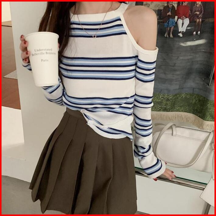 Ninabobo Sl026 Atasan Lengan Panjang Off Shoulder Stripe Halter Long Sleeve Sabrina T-shirt Wanita Knit Baju Top Garis