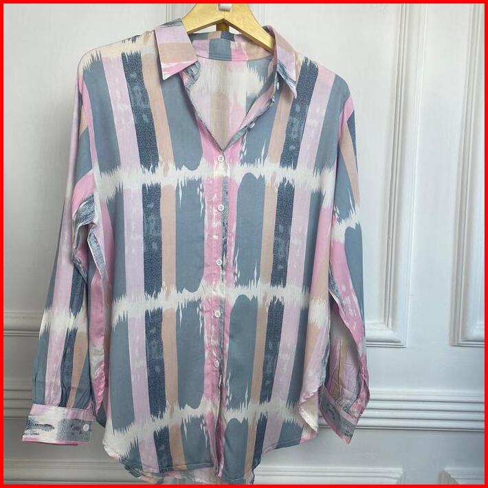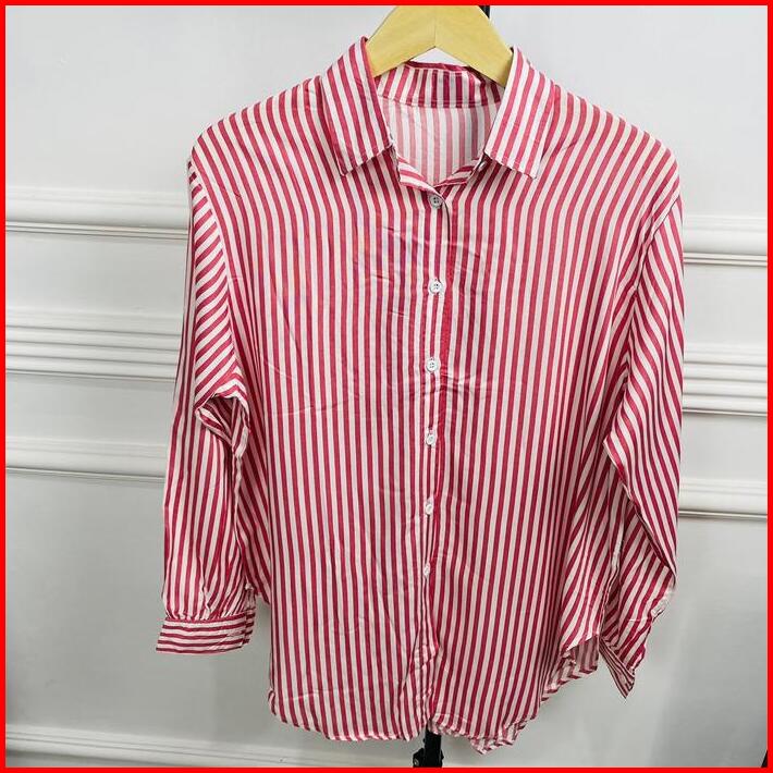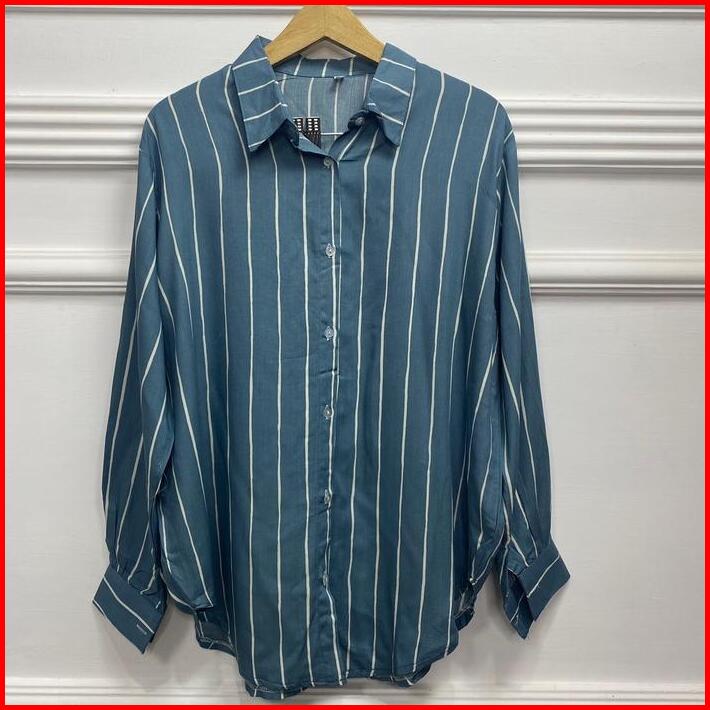 Cuci Gudang Kemeja Basic Motif Salur Bahan Rayon Setrip Atasan Wanita Lengan Kancing Baju Lembut Nyaman Lengan Panjang S