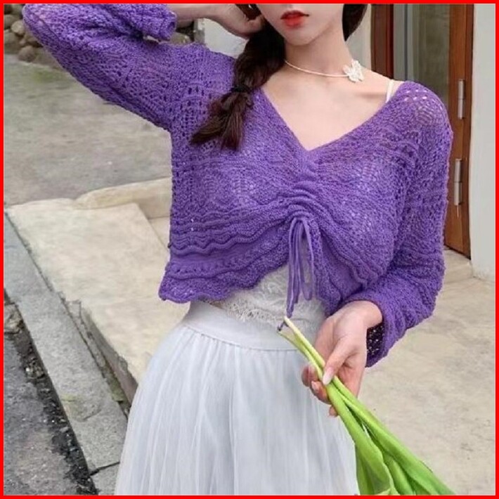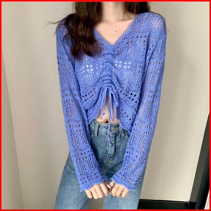 Miss O Atasan Baju Cardigan Croptop Wanita Lengan Panjang Motif Jaring Polos Bj1721