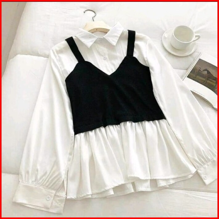 Wsw- Baju Atasan Wanita Blouse Cute Lengan Panjang Hitam Putih