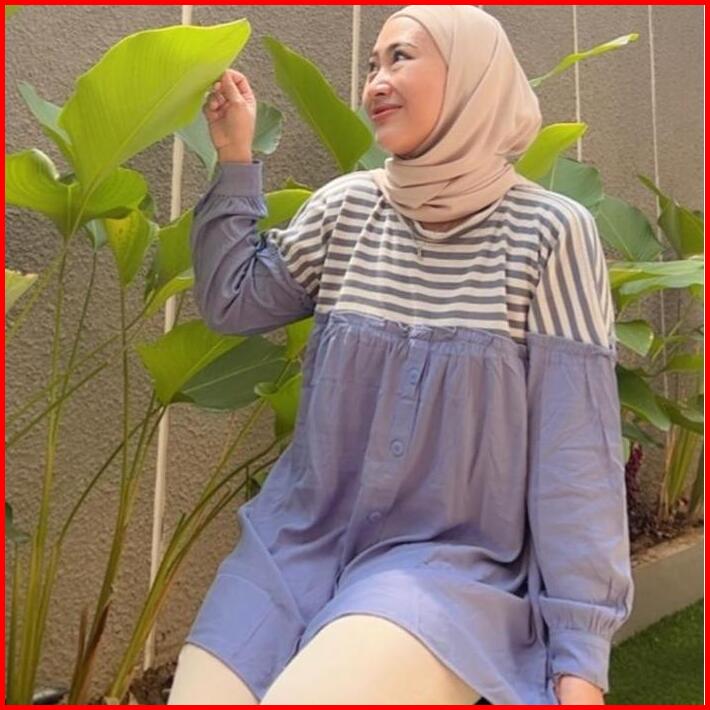 Fania Blouse Strip Rayon Knit Atasan Wanita Lengan Panjang Kombinasi Baju Cewek Casual Dewasa Katun Remaja Muslim Shakil