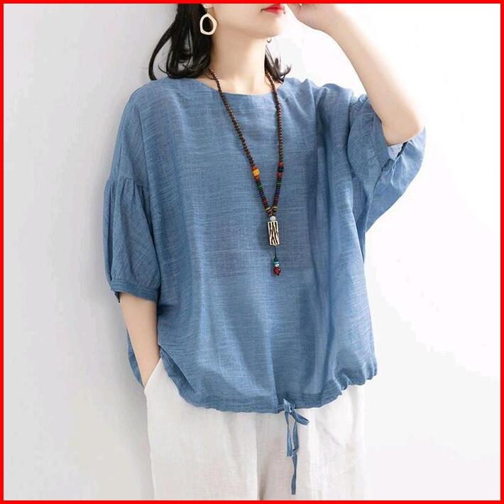 Blouse Wanita Serut Bawah Bahan Polo Linen Kekinian Atasan Cewek Casual Panjang Top Kemeja Viral Baju Mura Basic
