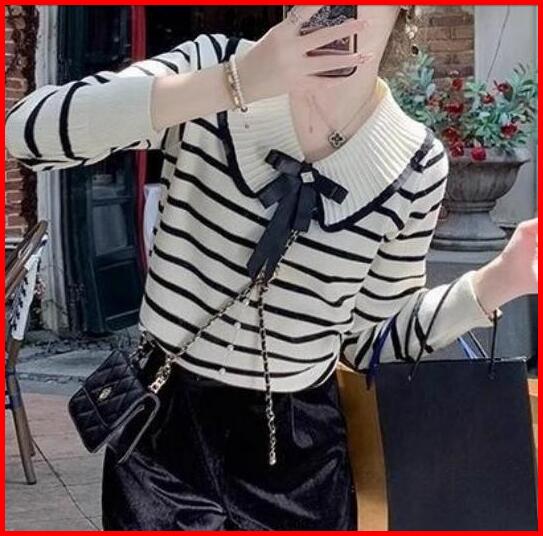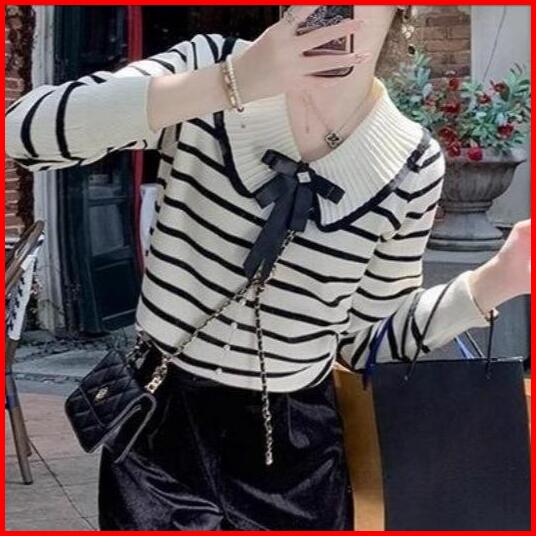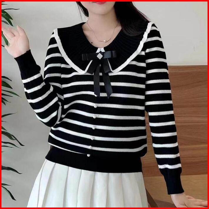 Tteuda Atasan Wanita Kekinian Kerah Sailor Pita Salur Lengan Panjang Knit Premium Baju Wanita Kerah Sailor Pita Striped