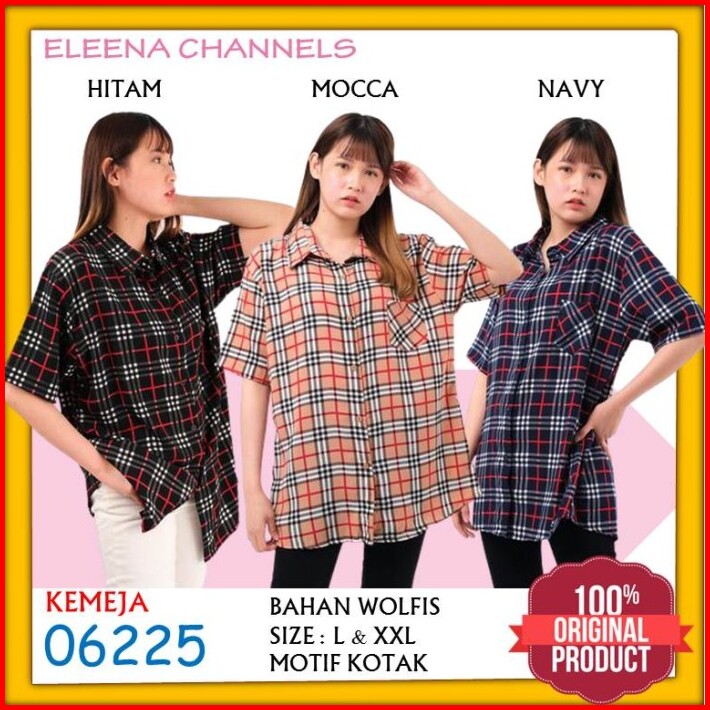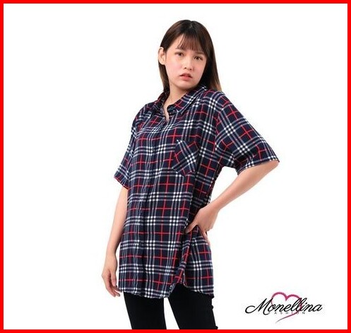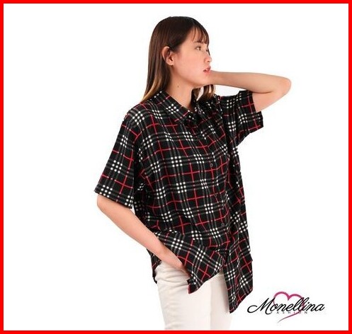 Baju Kemeja Atasan Wanita Casual Jumbo Motif Kotak Lengan Pendek 06225