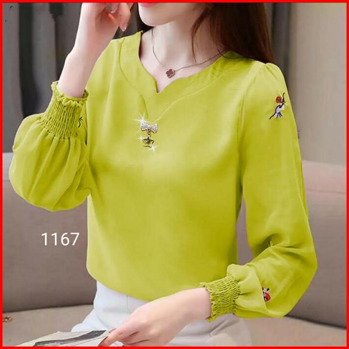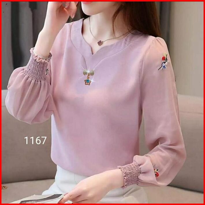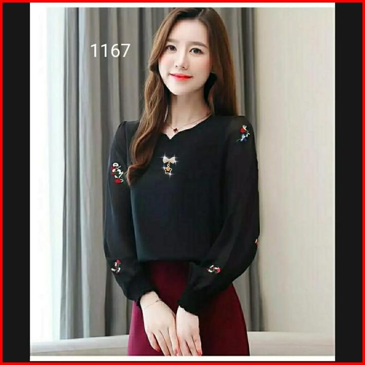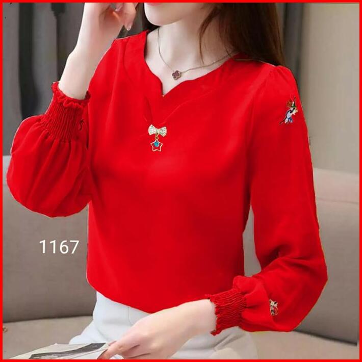 Blus Gaya Korea Atasan Fashion Wanita 1167 Bordir Cantik Baju Motif Panjang Top Merah Nyaman