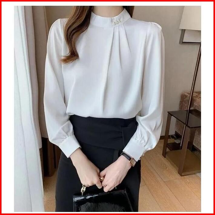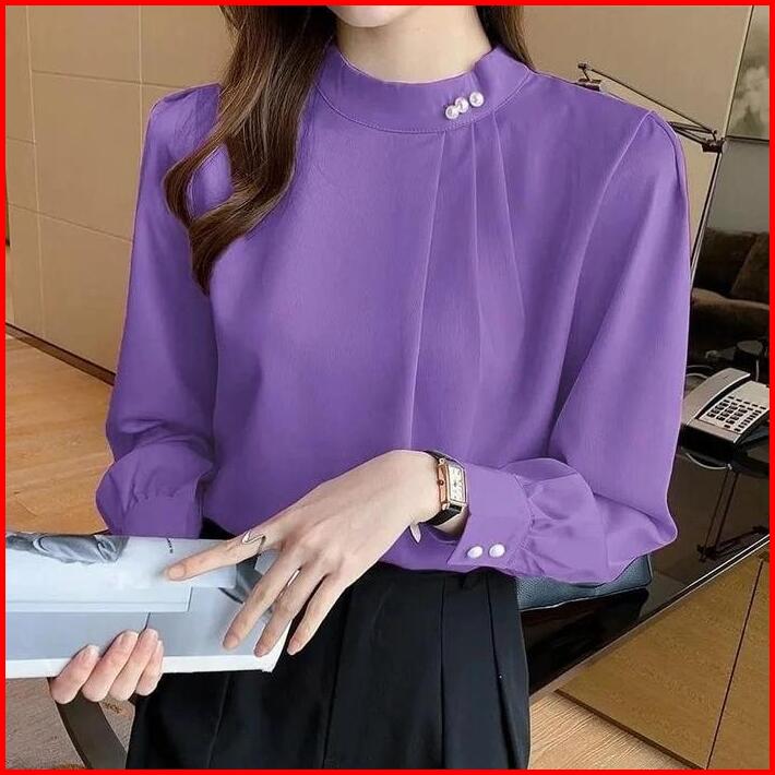 Keyshia Blouse Atasan Wanita Polos Bahan Shakila Baju Kancing Kerah Tangan Variasi Hitam Casual Lushangya Kemeja Panjang