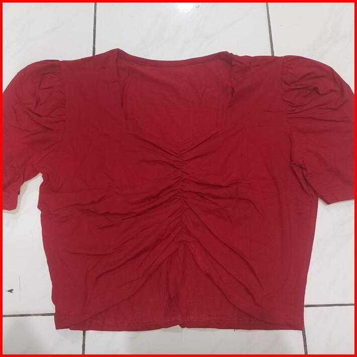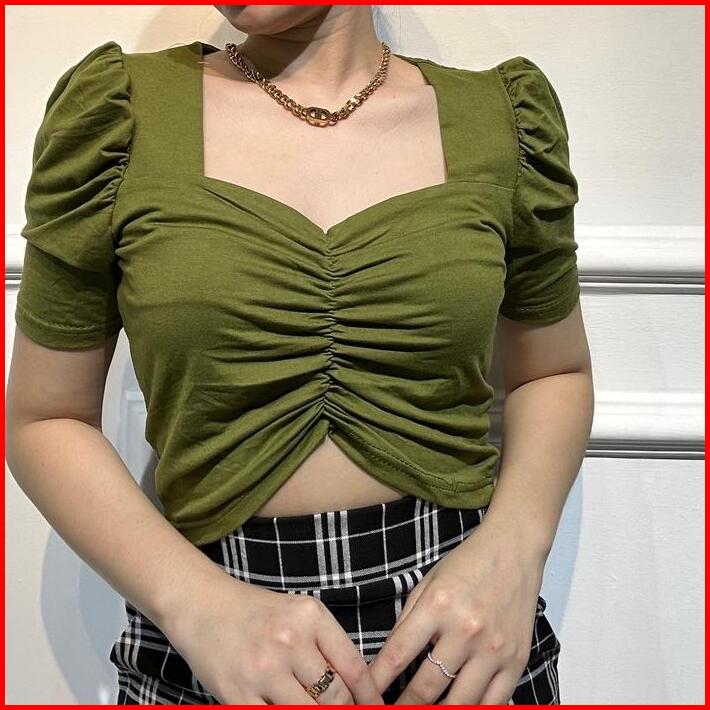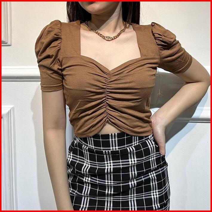 Crop Top Scrunchie Puffy Sleeve Crop Top Puffy Baju Atasan Wanita Kerut Depan Bahan Spandek Nyaman Oversize