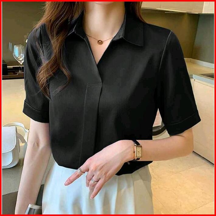 Baju Wanita Kantoran Aluna Basic Blouse Korean Style Atasan V Neck Lengan Pendek Baju Santai Nyaman Formal Polo Linen Vi