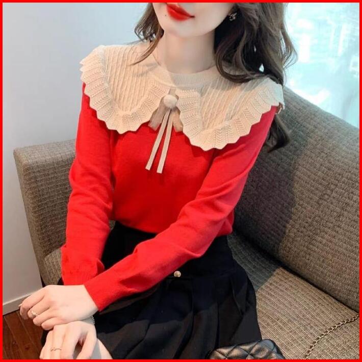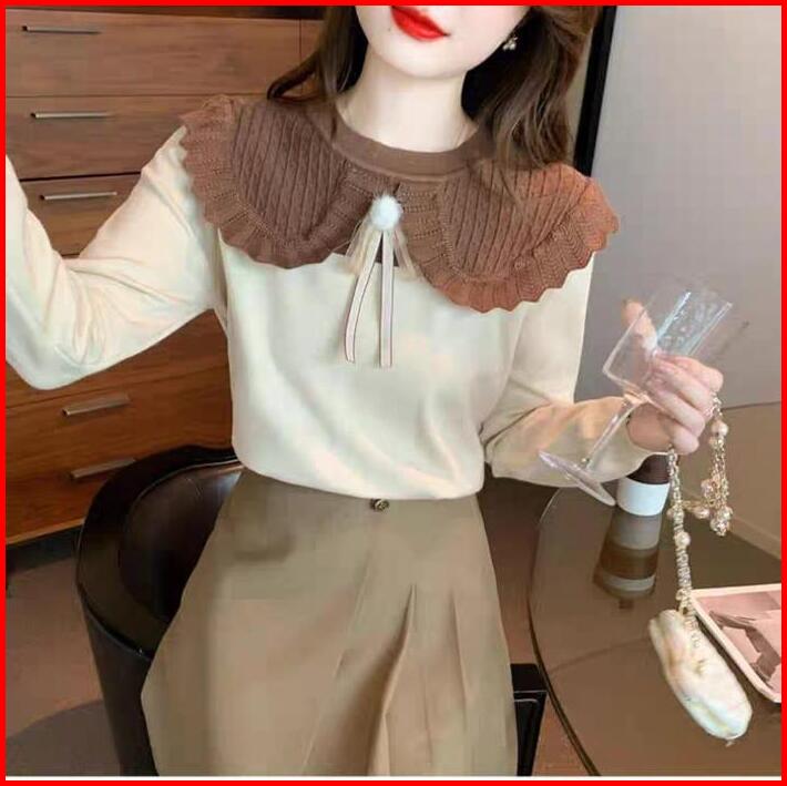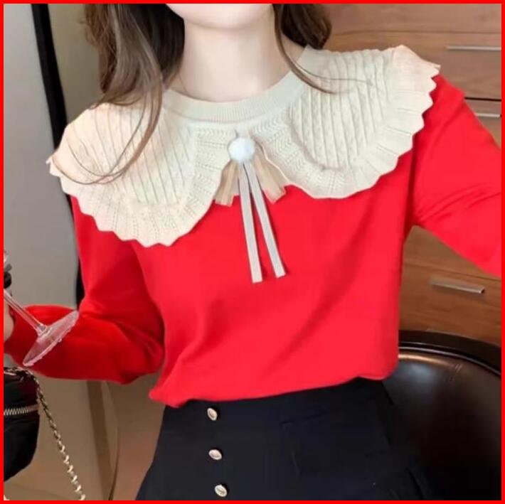 Daria Big Collar Knitted Top Fit M-3xl Fashion Atasan Wanita Blouse Bahan Rajut Lengan Panjang Kerah Besar Casual Kasual