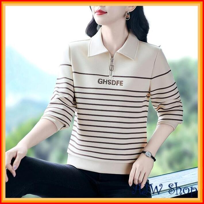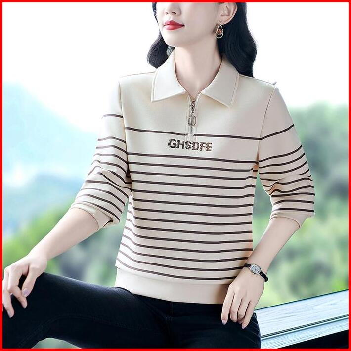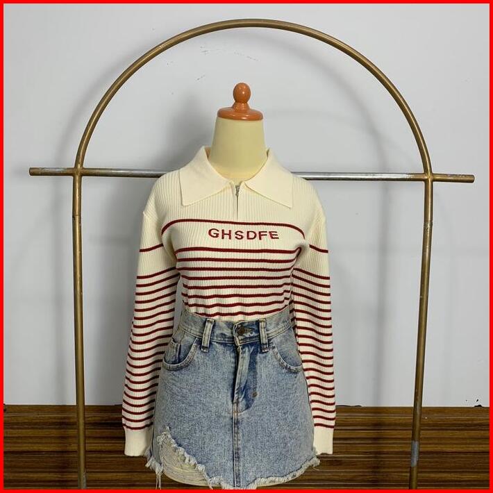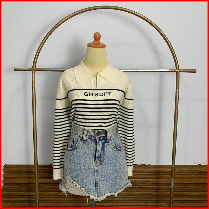 Ajw Xac Atasan Wanita Stripe Zipper Knit Premium Baju Wanita Stripe Zipper Lengan Panjang Terbaru Pakaian Wanita Kekinia