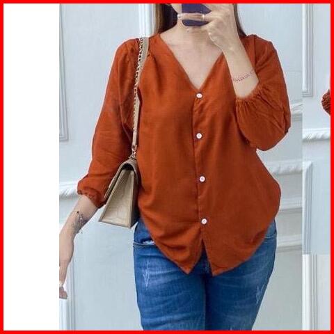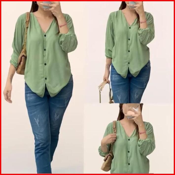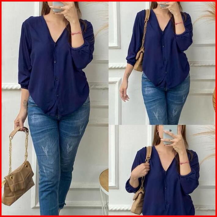 Ld 90- 95 Blouse Kancing V-neck Polos 7warna Lengan Kerut Wanita Panjang Atasan Kerah Cewek Casual Busui Fit Tebal Baju