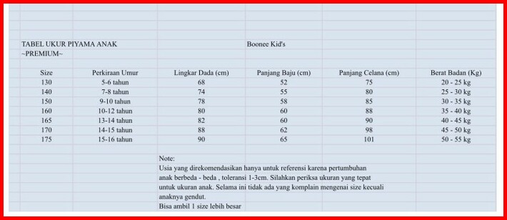 S140 7-8 TAHUN, S150 9-10 TAHUN, S160 11-13 THN, S165 13-14 THN, S170 14-15 THN, S175 15-16 THN