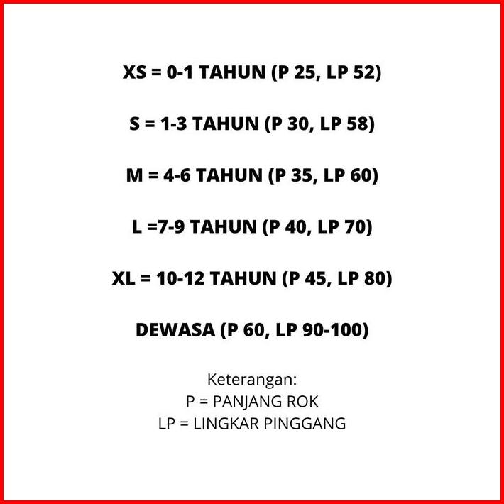 XS = 0-1 TAHUN , S = 1-3 TAHUN , M = 4-6 TAHUN, L =7-9 TAHUN, XL = 10-12 TAHUN