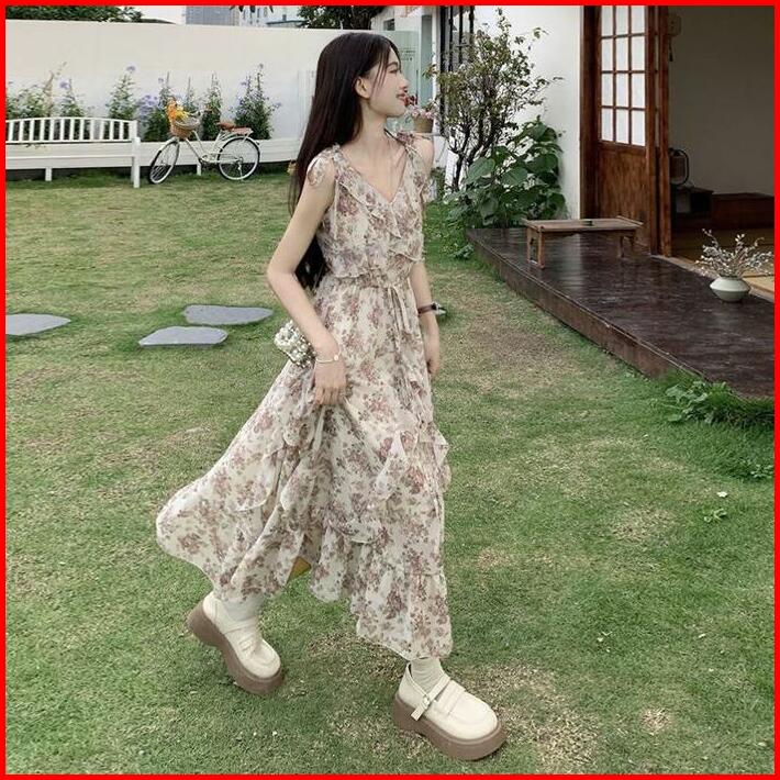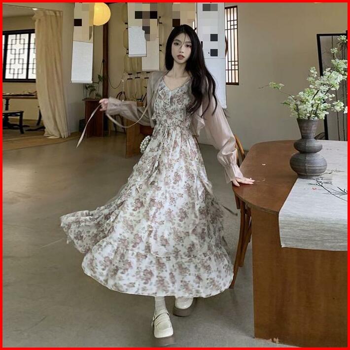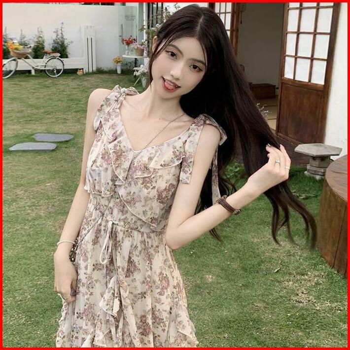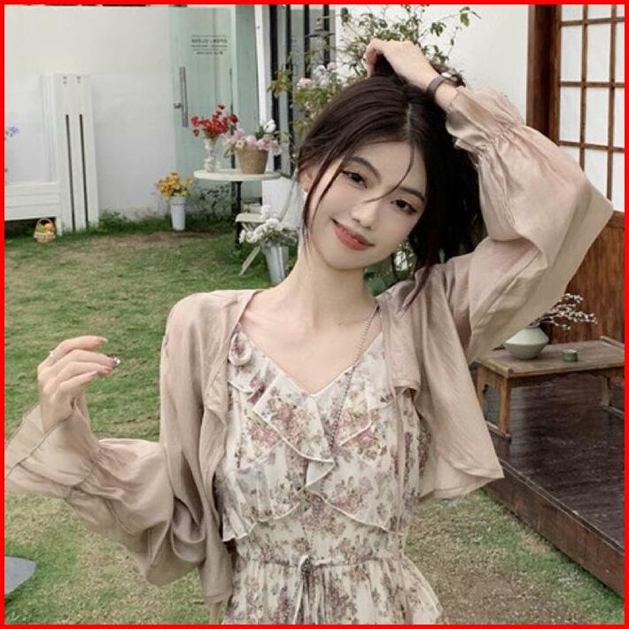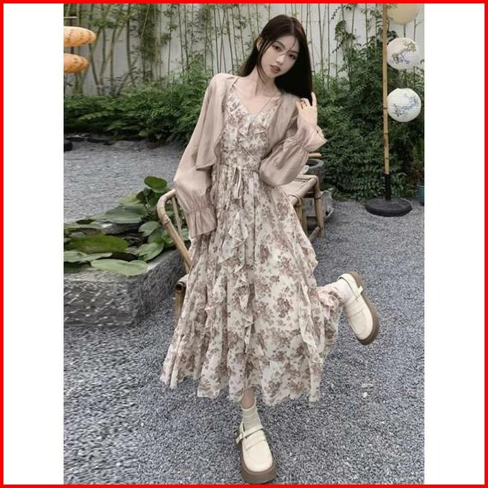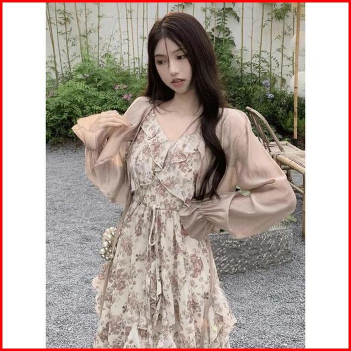 First Girl- Ready Stock Set Bisa Dibeli Terpisah Dress Suspender Cardigan Fairy Floral Ruffle Dress Pantai