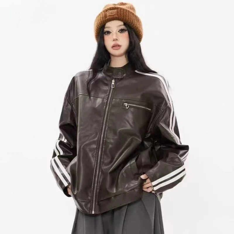 Leather Jaket Motorcycle Jaket Kulit Pria Dan Wanita Strip Oversize