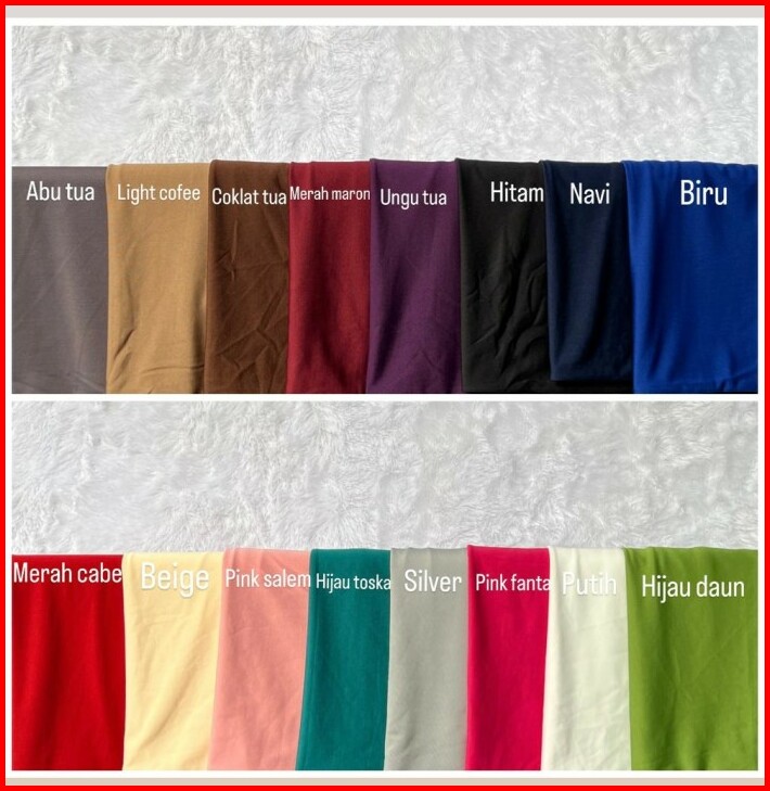 MERAH CABE, PINK SALEM, HIJAU TOSKA, HIJAU DAUN, MILO, PUTIH, HITAM, ABU TUA, COKLAT TUA, BIRU