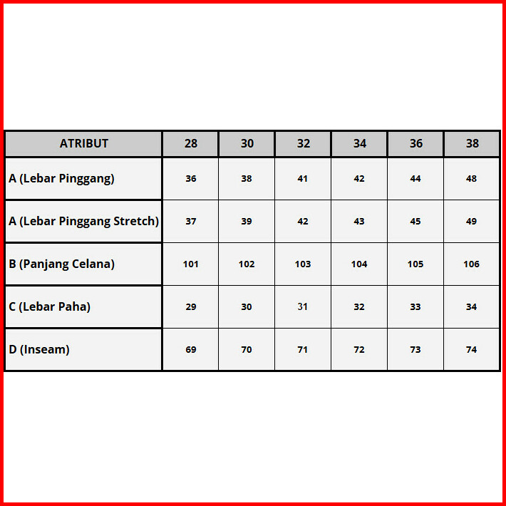SIZE 28, SIZE 30, SIZE 32, SIZE 34, SIZE 36, SIZE 38