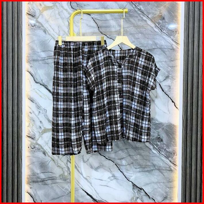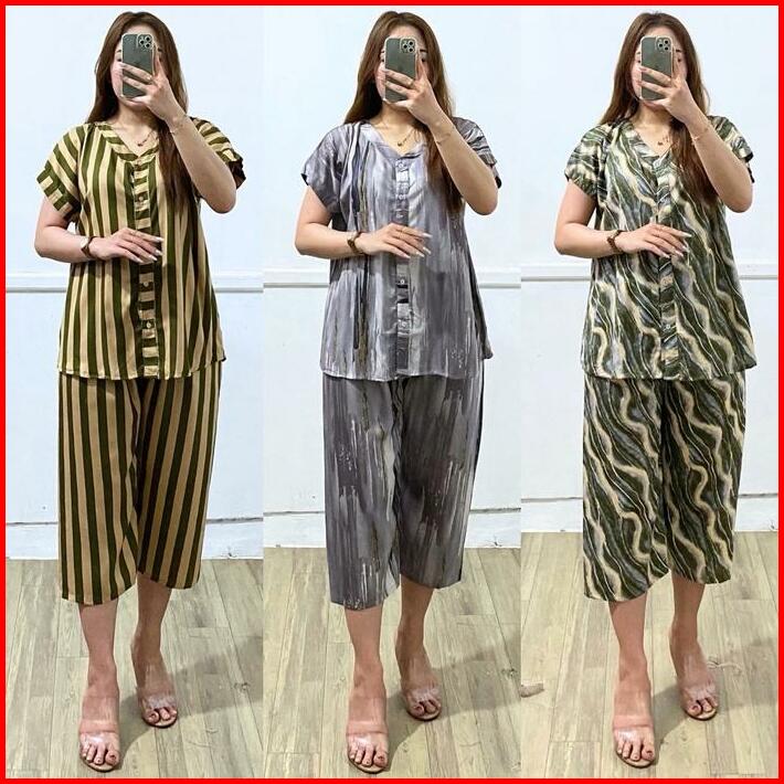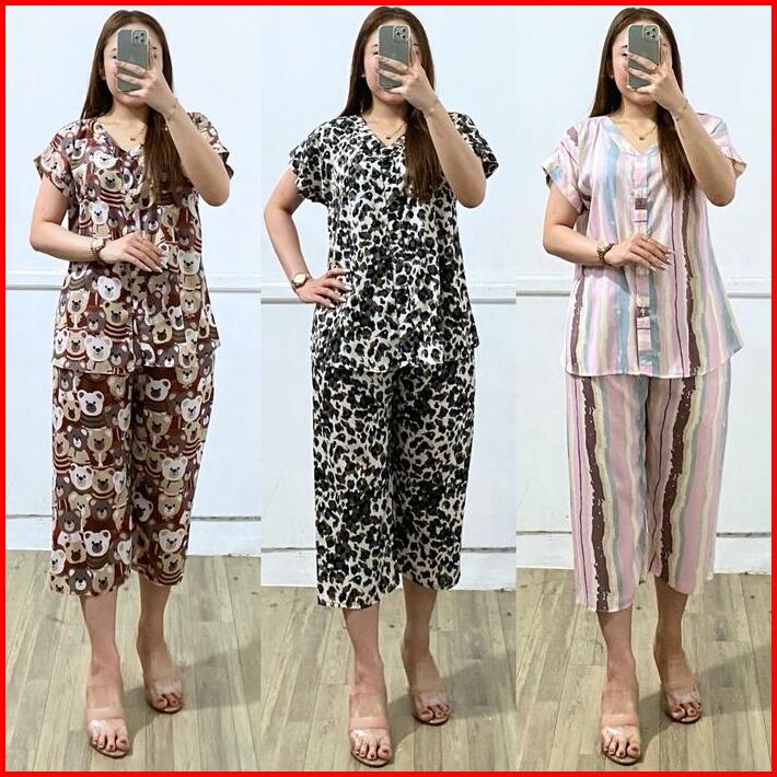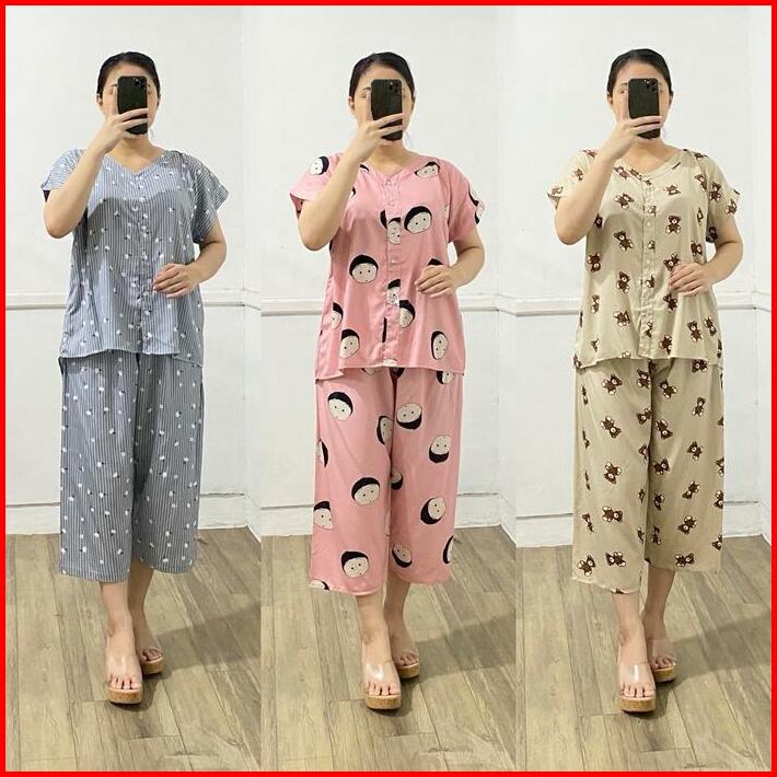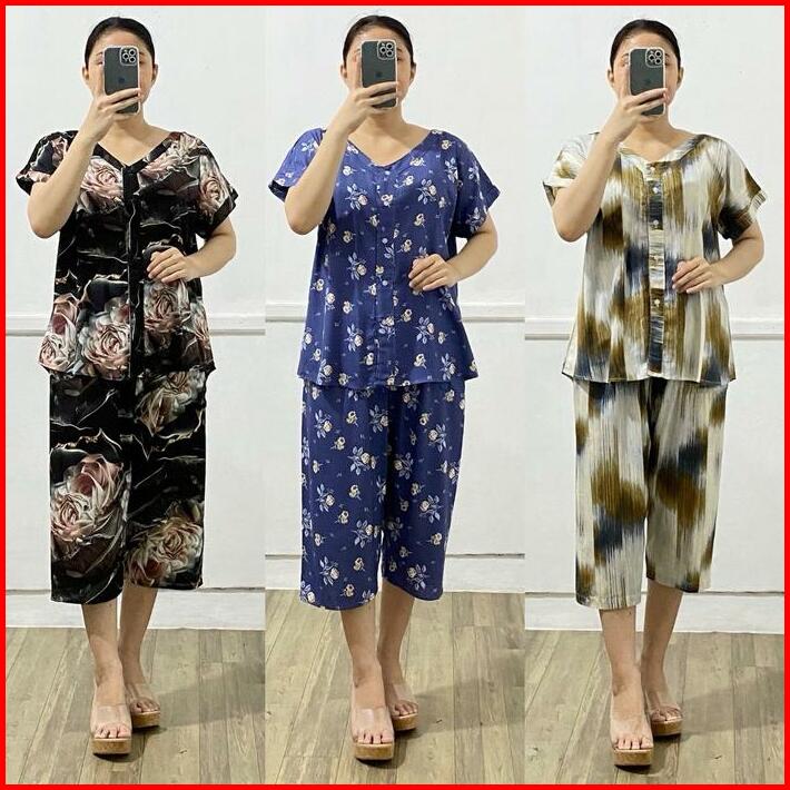 Piyama Rayon 7 8 Setelan Celana 7 8 Set Baju Tidur Pajamas Full Kancing Kerah Vneck Wanita Pendek