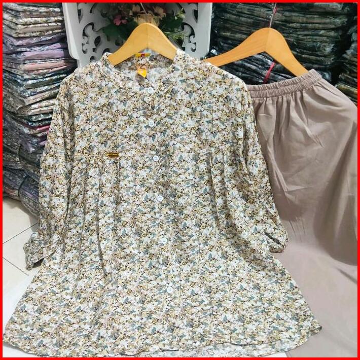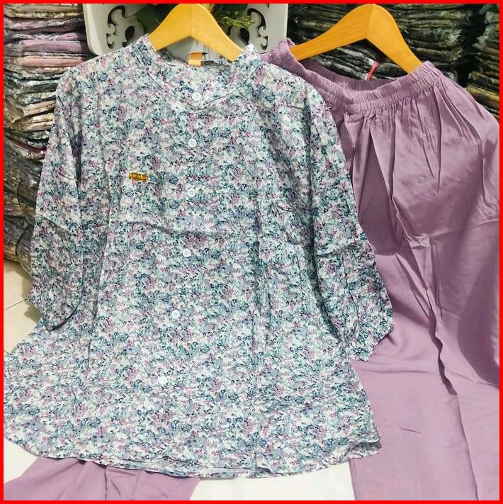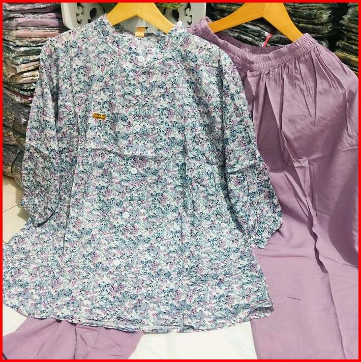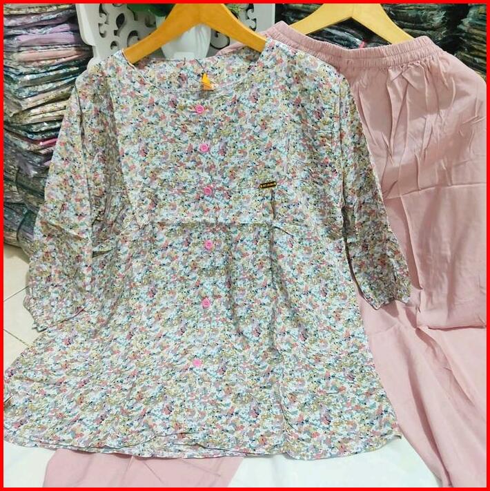 Baju Setelan Wanita 2025 Nyaman Dipakai One Set Kombinasi Bahan Katun Rayon Motif Bunga Kotak Lengan 7 8 Karet Serut Cel
