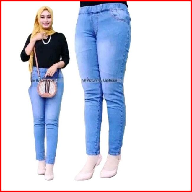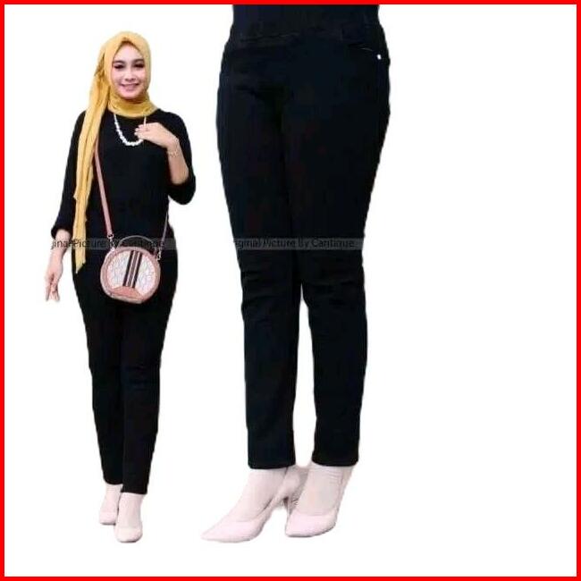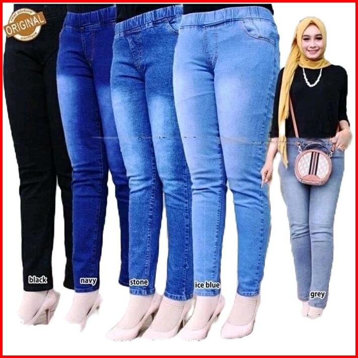 Celana Jeans Pinggang Karet Jumbo Celana Legging Jeans Wanita Slim-fitting Melar Panjang Hitam Denim Skinny Celanajeans