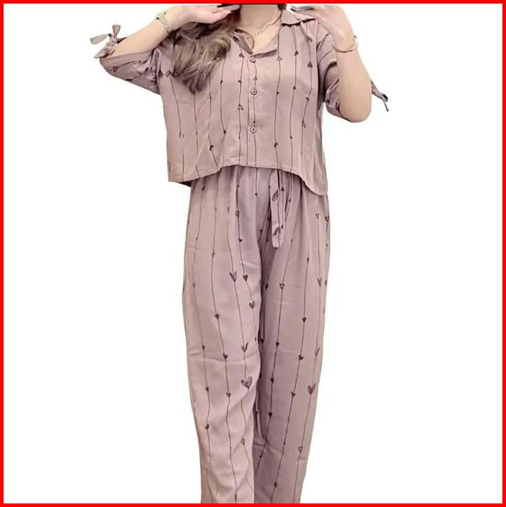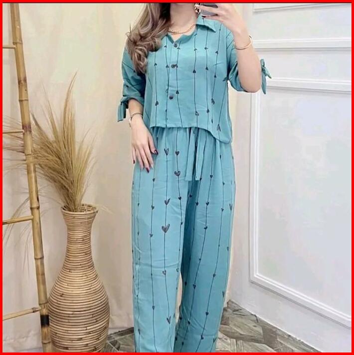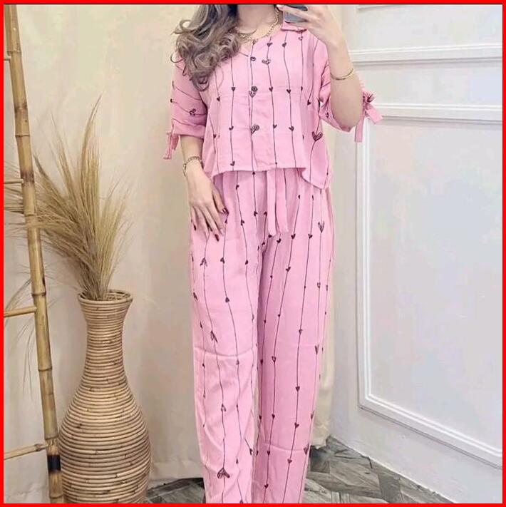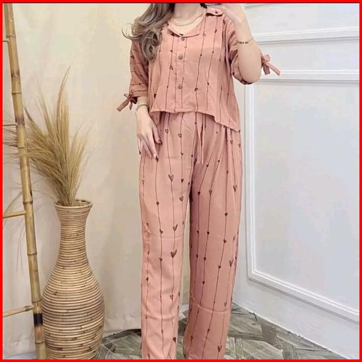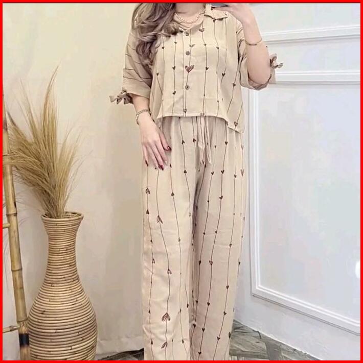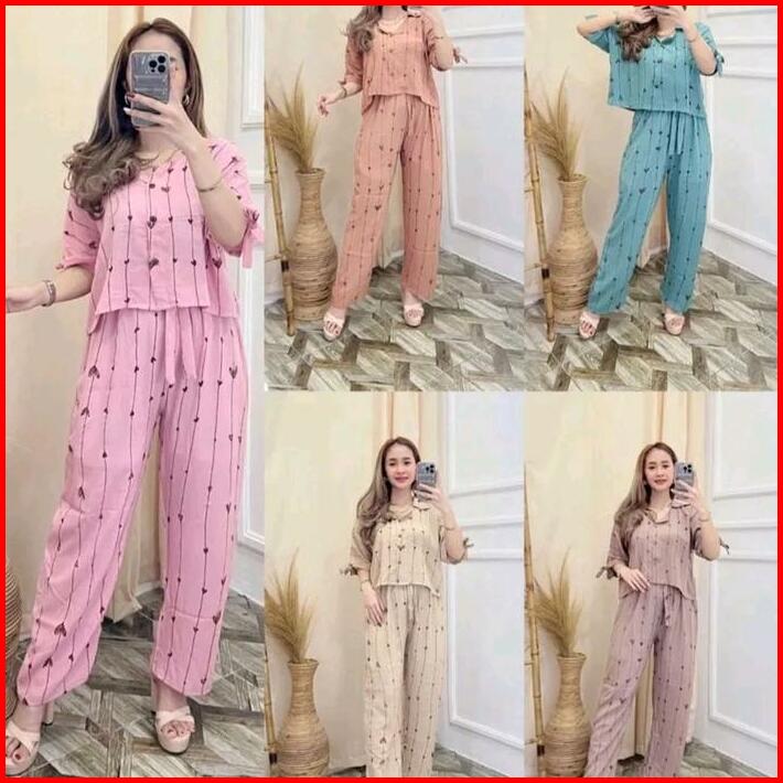 Viral Crop One Set Motif Love Outfit Wanita Kekinian Kancing Setelan Celana Pita Rayon Dewasa Remaja Casual Baju Atasan