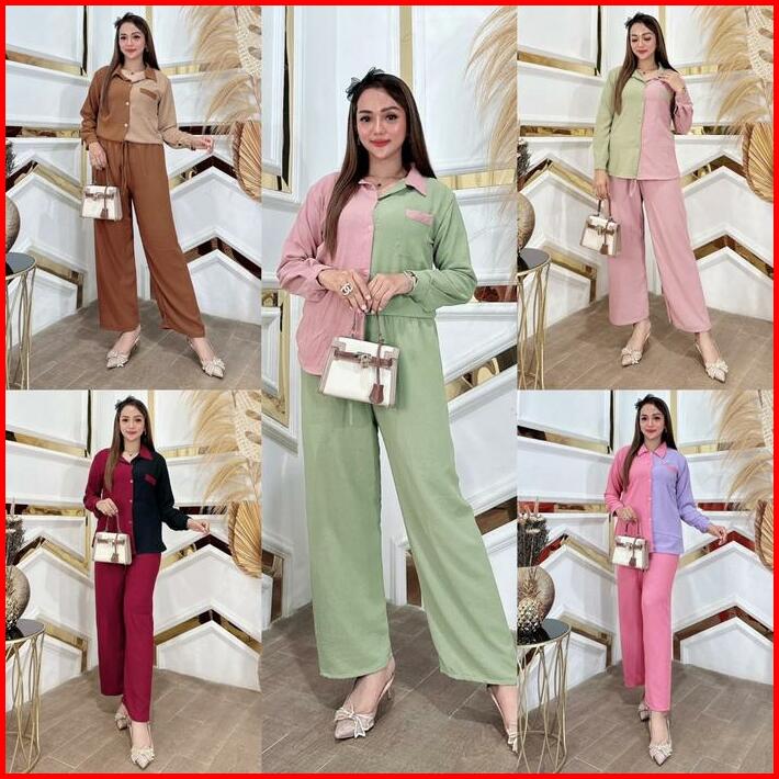 Setelan Wanita Dewasa Sopal Cringkel Air Flow Premium Terbaru Airflow Baju Kancing Celana Karet Panjang Nyaman One Set V