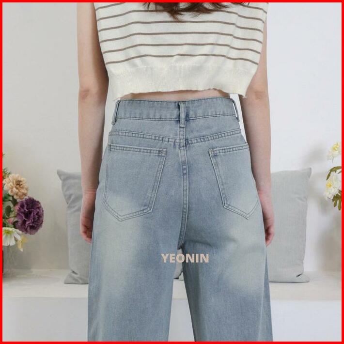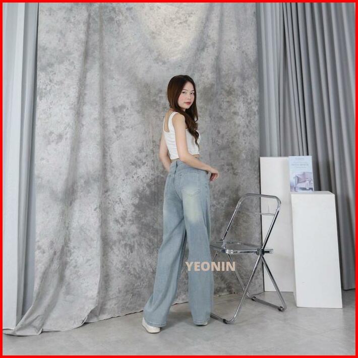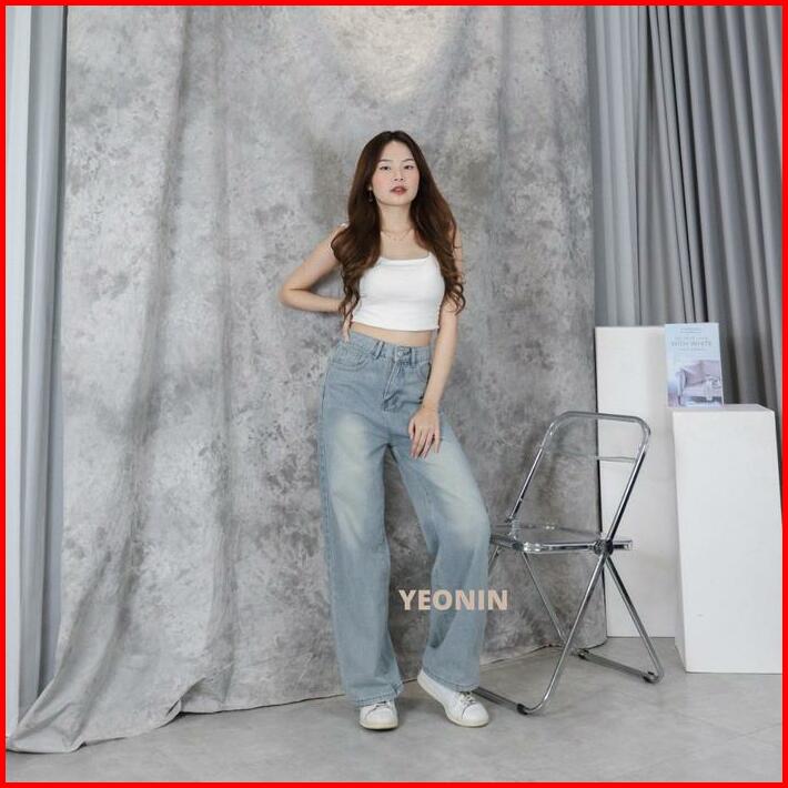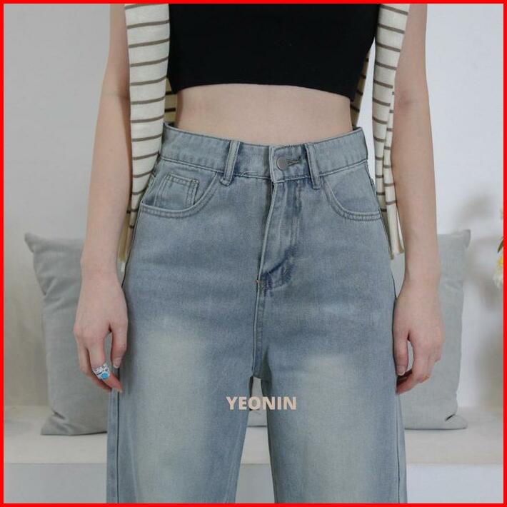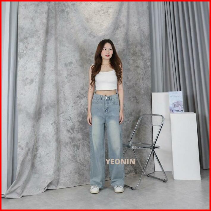 Yeonin Celana Panjang Wanita High Waist Straight Cut Jeans Demin Cewek Baggy Light Blue Washed Jeans Kekinian 308