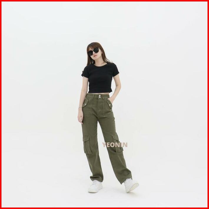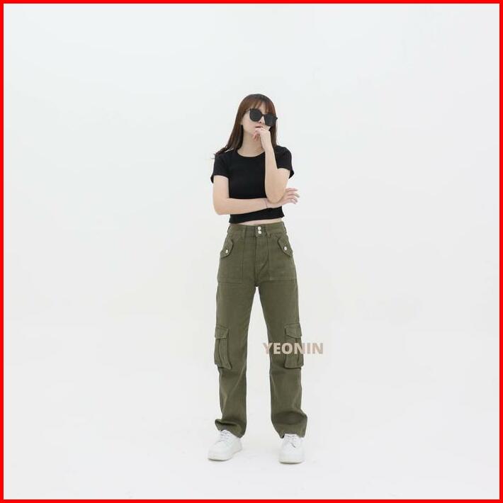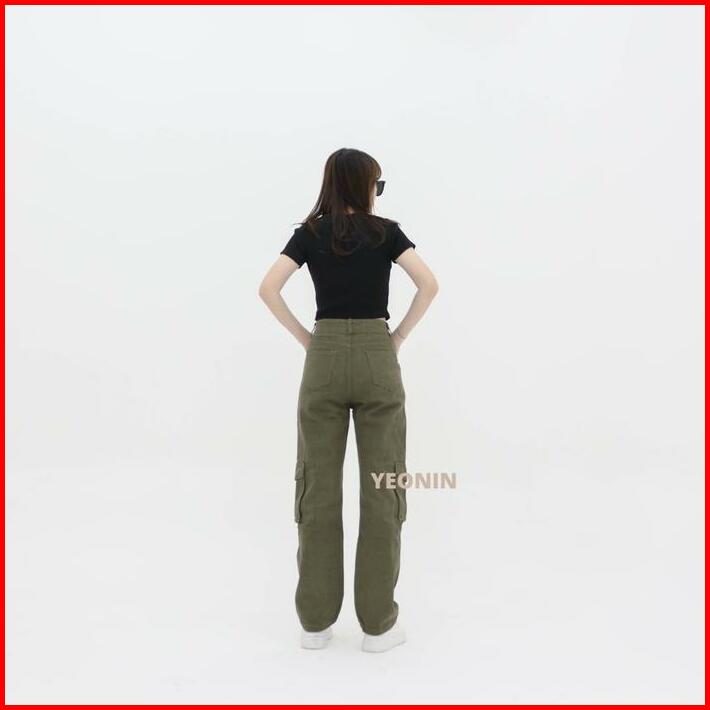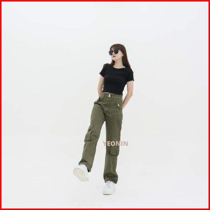 Yeonin Army Women Cargo Pants Celana Panjang Wanita Cargo Polos Warna Yeonin High Waist Kantong Straight Loose Casual 56
