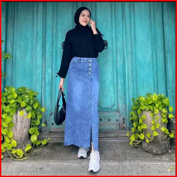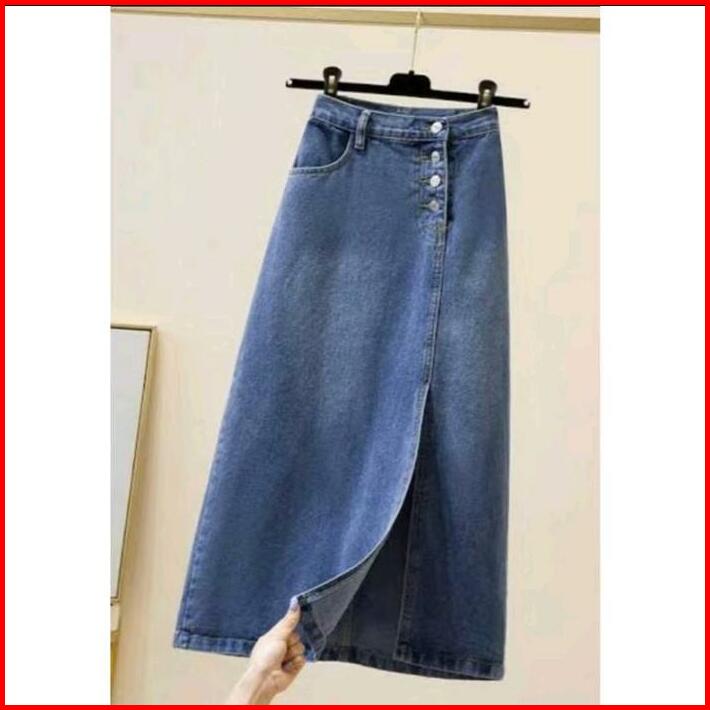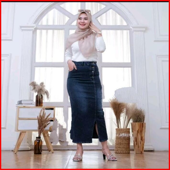 Rebecca Zifana Rok Jeans Belah Samping Skrirt Jeans Korean Style Denim 7 8 Onder Span Kancing Karet