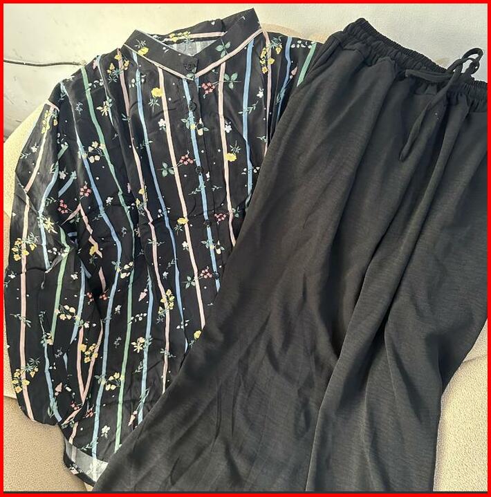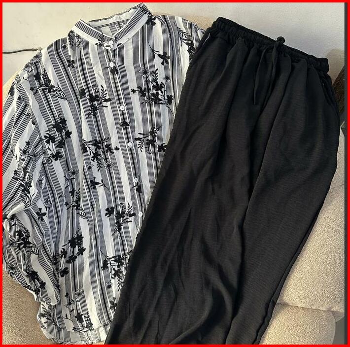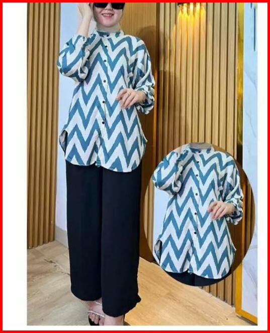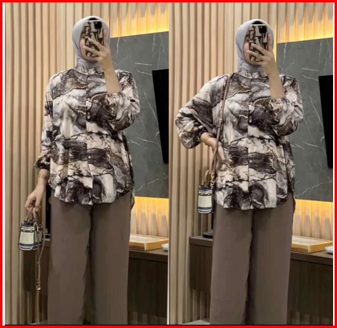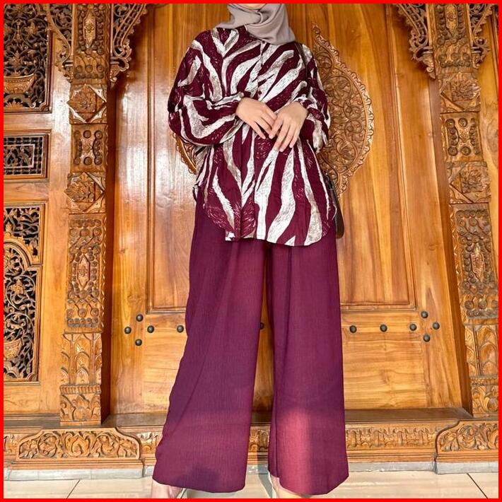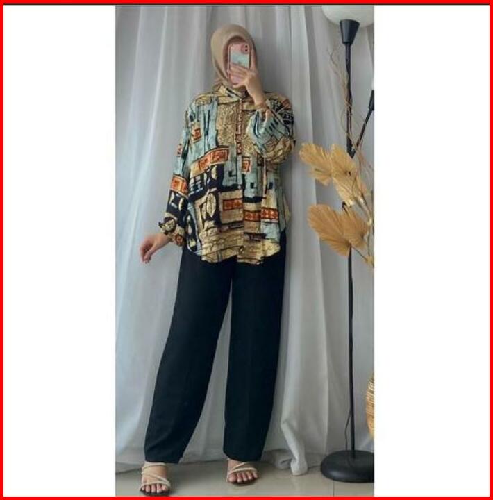 One Setelan Jumbo Rayon Set Kekinian Kemeja Rayon Motif Mix Crincle Celana Panjang Karet Pinggang Crinkle Muslim