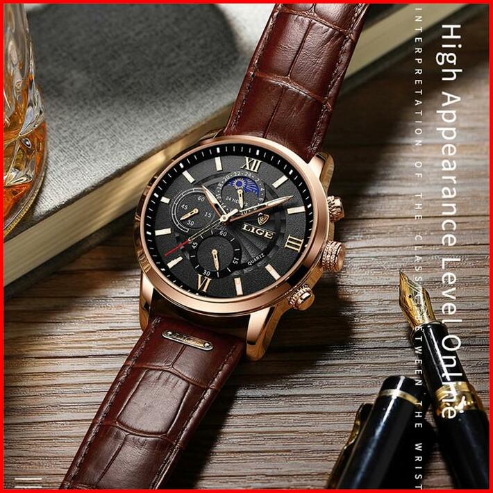 Lige Original Jam Tangan Pria 2022 Tali Kulit Anti Air Olahraga Kronograf Jam Tangan Kotak Hadiah Quartz Watch