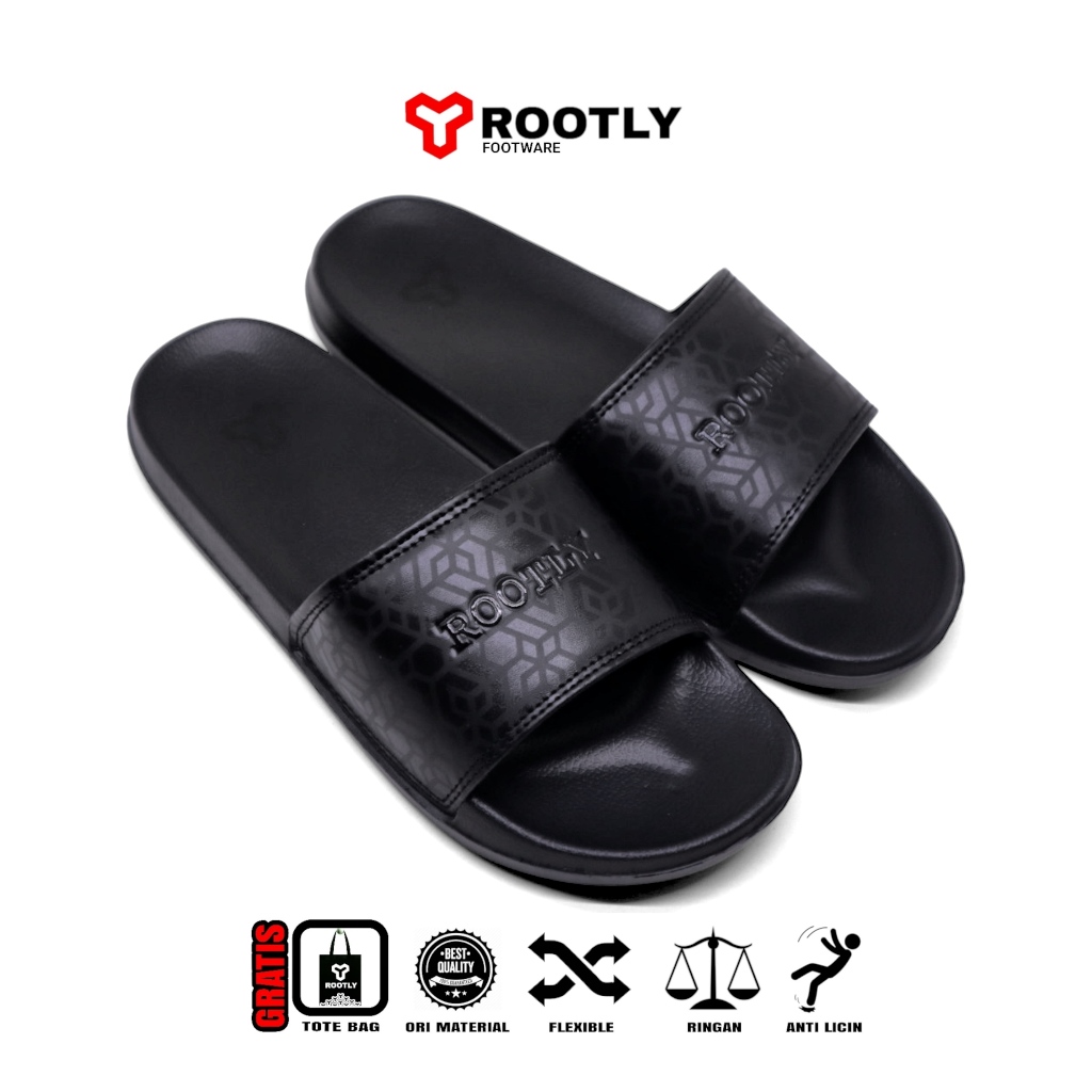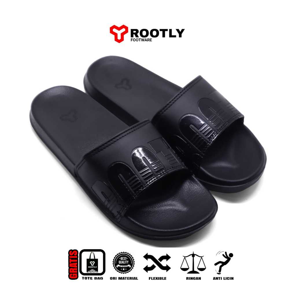 SANDAL SLOP PRIA / ROOTLY - SANDAL PRIA HITAM LOGO TIMBUL / SANDAL PRIA DEWASA ORIGINAL