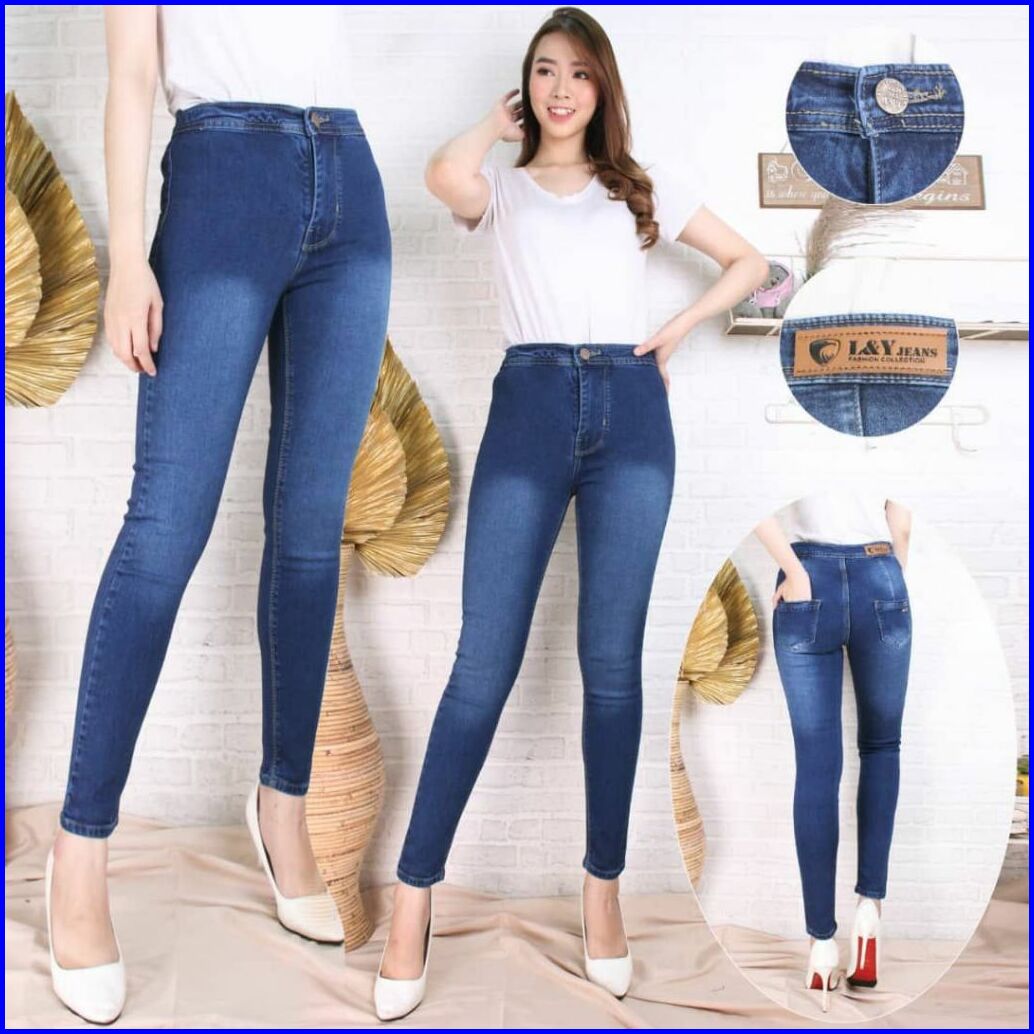 Celana Haighwaist Polos Celana Jeans Wanita Pinggang Tinggi Bahan Melar