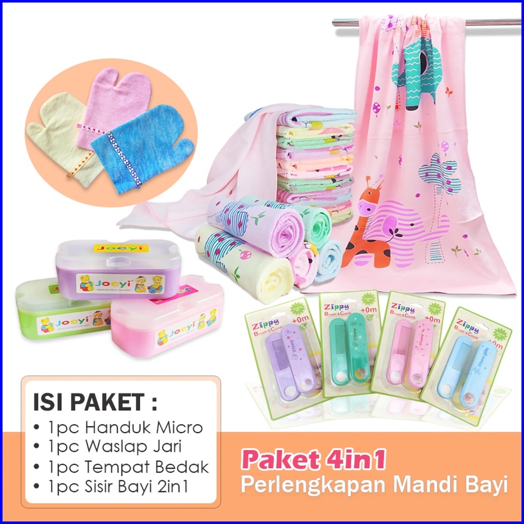 Paket Hemat 4in1 Perlengkapan Mandi Bayi Sisir Tempat Bedak Handuk Waslap Bayi