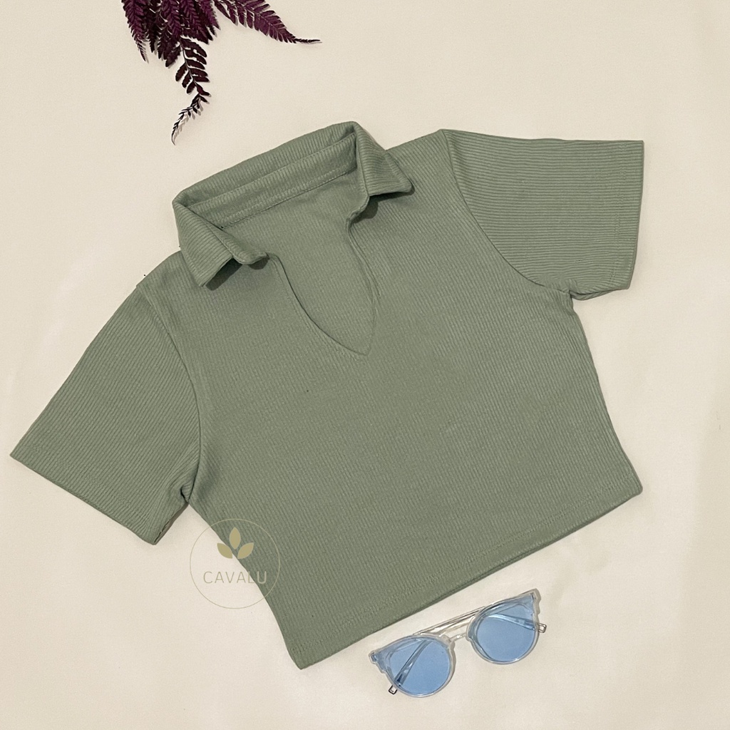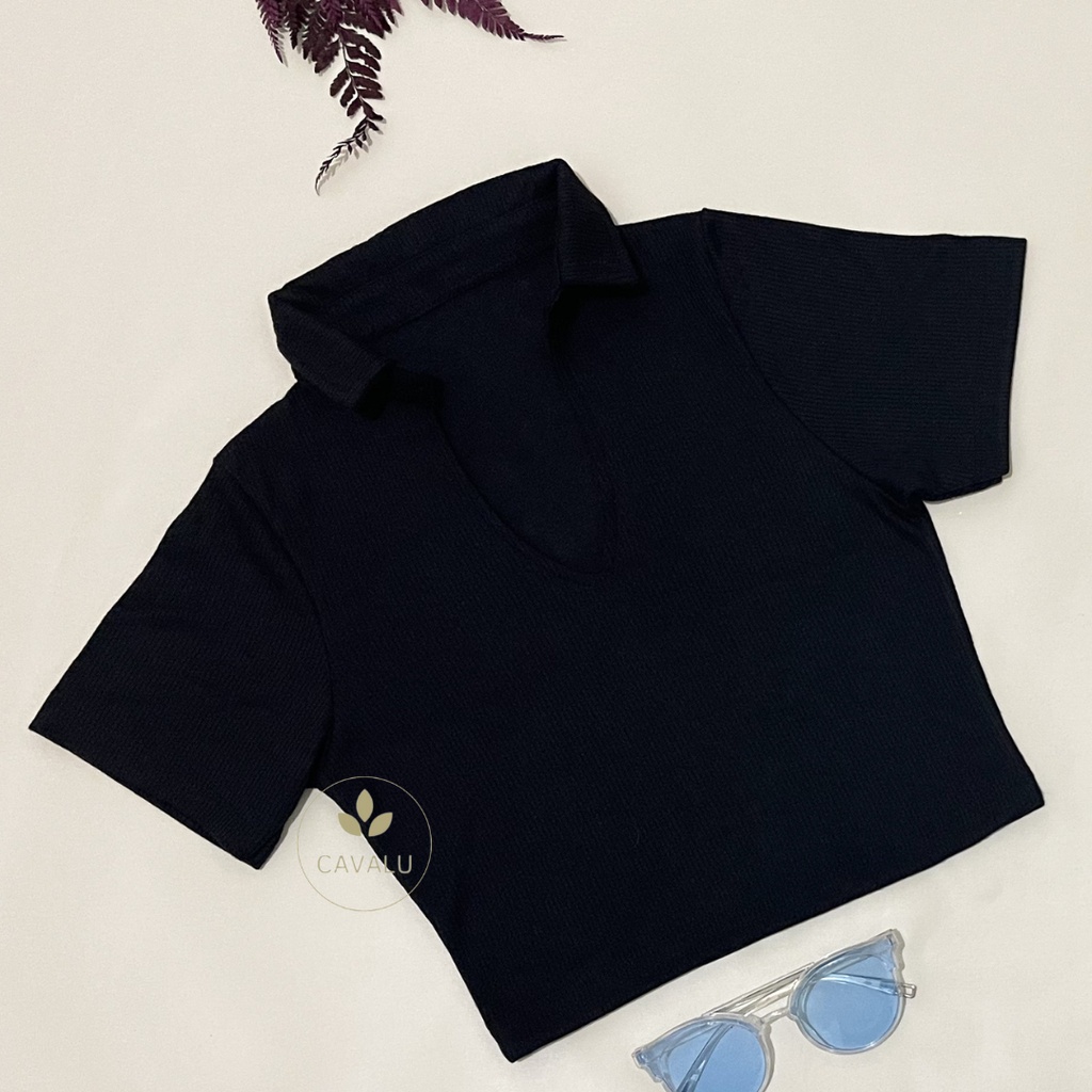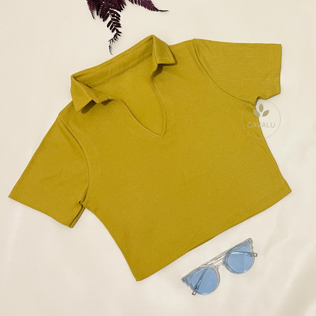 CAVALU Knit Crop Top Korea Kaos Kerah Wangky Polo Shirt Baju Kerja Atasan Wanita 076