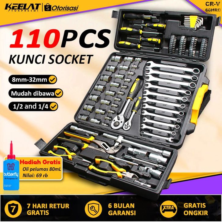 KEELAT 110 Pcs Kunci Sok Set【60HRC】Socket Full Lengkap Socket Tool Kit Pas Ring Motor Kunci Socket Wrench Pas Sok Shock