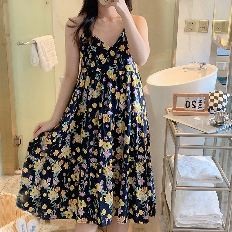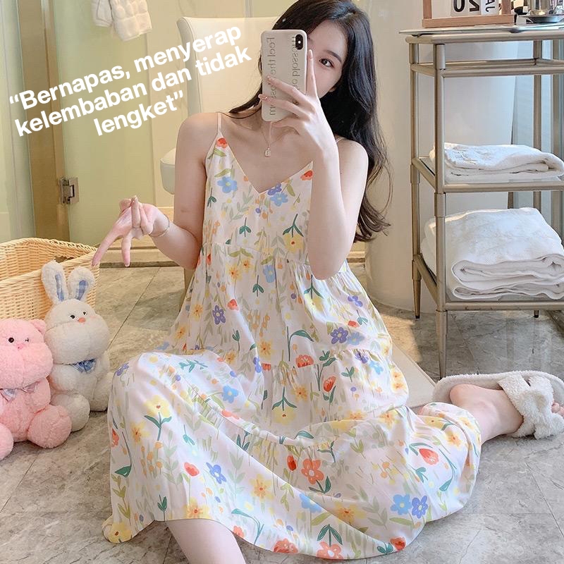 Gadis Kitty Baju Tidur Longgar Panjang Wanita Aun Tidur Rumah Manis Motif Bunga Kecil