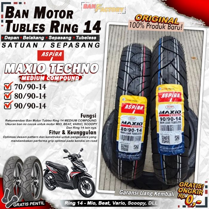 [ FREE ONGKIR ] Ban Motor ASPIRA MAXIO TECHNO Ring 14 Tubeless Ban Tubles depan belakang Motor Matic Beat